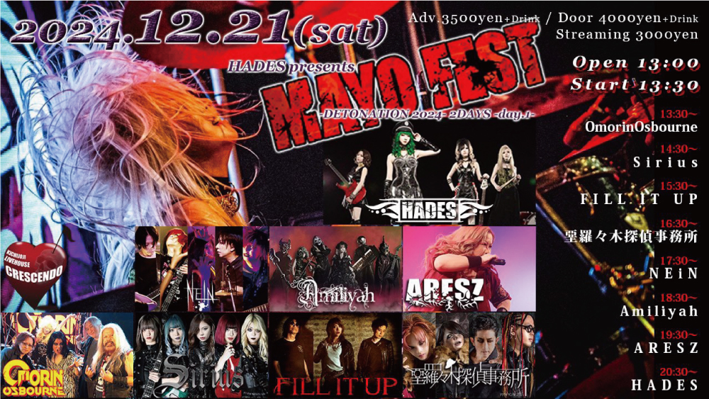 12月21日(土)NEiN 吉祥寺CRESCENDO「HADES presents MAYO FEST -DETONATION 2024- Day.1」他